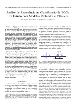 A detecção precoce de arritmias a partir de eletrocardiogramas (ECGs) pode ser decisiva para o tratamento de doenças cardiovasculares, que ainda são a principal causa de mortes no mundo. Muitos trabalhos têm explorado técnicas de processamento de sinais e aprendizado de máquina neste problema, havendo já iniciativas que empregam gráfioos de recorrência para a caracterização dos sinais cardíacos. Porém, poucos trabalhos realizaram uma comparação mais ampla com outras estratégias de representação dos ECGs junto a diferentes classificadores. Neste trabalho, aplicamos a análise de recorrência para descrever os ECGs da base MIT-BIH ARR, avaliando seu impacto sobre modelos tradicionais e profundos (e.g., ResNet) de classificação. Além disso, avaliamos também as representações temporais e os espectrogramas (SPGs). Os resultados obtidos indicam que TS com k-vizinhos mais próximos alcançaram a melhor F-medida (0,7980), enquanto os gráficos de distância (DPs) com KNN fornecem a maior precisão e especificidade, além de superarem consistentemente os desempenhos atingidos com os gráficos de recorrência (RPs).Download