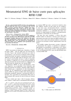 Um metamaterial ENG de baixo custo voltado para aplicações RFID que usam a faixa de frequências UHF (902-928 MHz) é proposto, projetado, fabricado e validado nesse artigo. O metamaterial ENG é feito a partir de fios de cobre e filme plástico, refletindo ondas planas e permitindo o trânsito de ondas evanescentes elétricas. Resultados de simulação e experimentais são apresentados e discutidos.Download